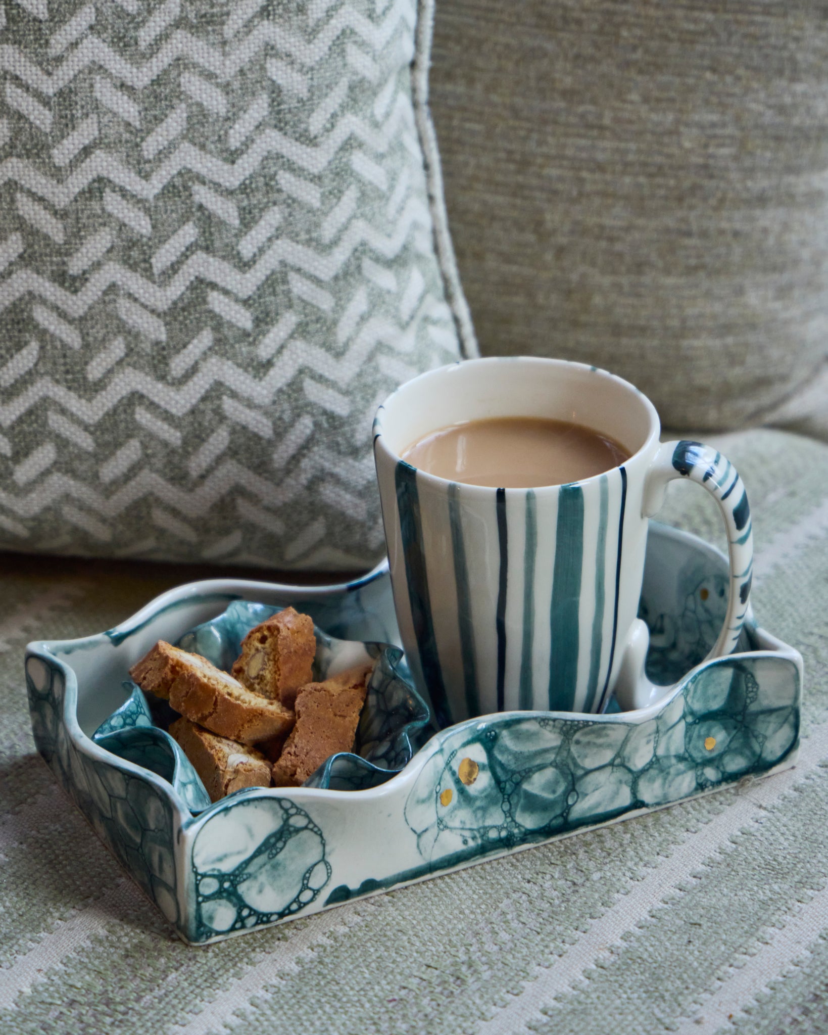 This cosy mug set pairs two simple but distinctive designs; one finished with our teal bubble glaze and the other with soft teal stripes. Together they bring a gentle mix of pattern and colour, adding a relaxed charm to everyday tea moments, while remaining dishwasher safe and easy to care for. The bubble mug features clusters of delicate teal bubbles drifting across the porcelain, while the stripe mug is marked with fine lines that gracefully fall down its surface. Each piece is slightly different, celebrating the beauty of hand made items.