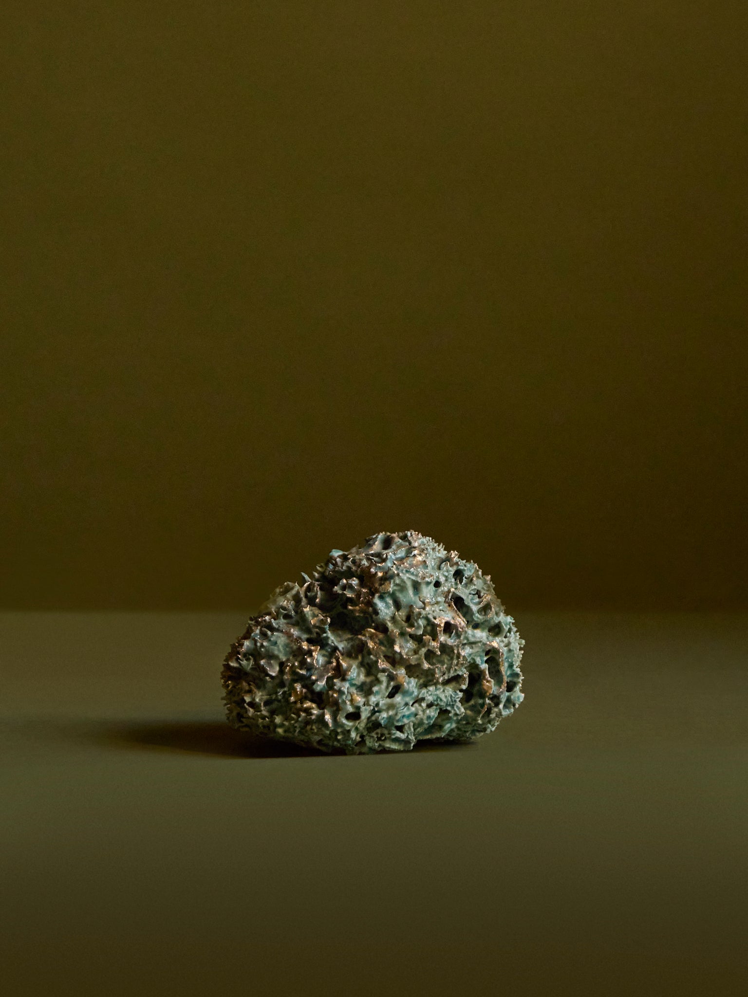 A beautiful ornamental sea sponge sculpture made from white stoneware and finished with an aquatic blue-green glaze with gold leaf. A wonderful gift idea for the person who has everything.