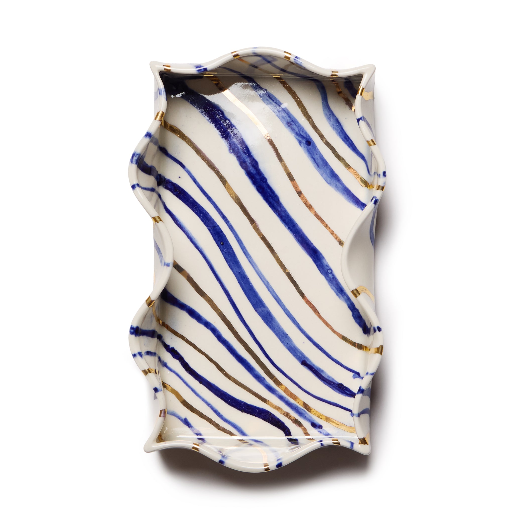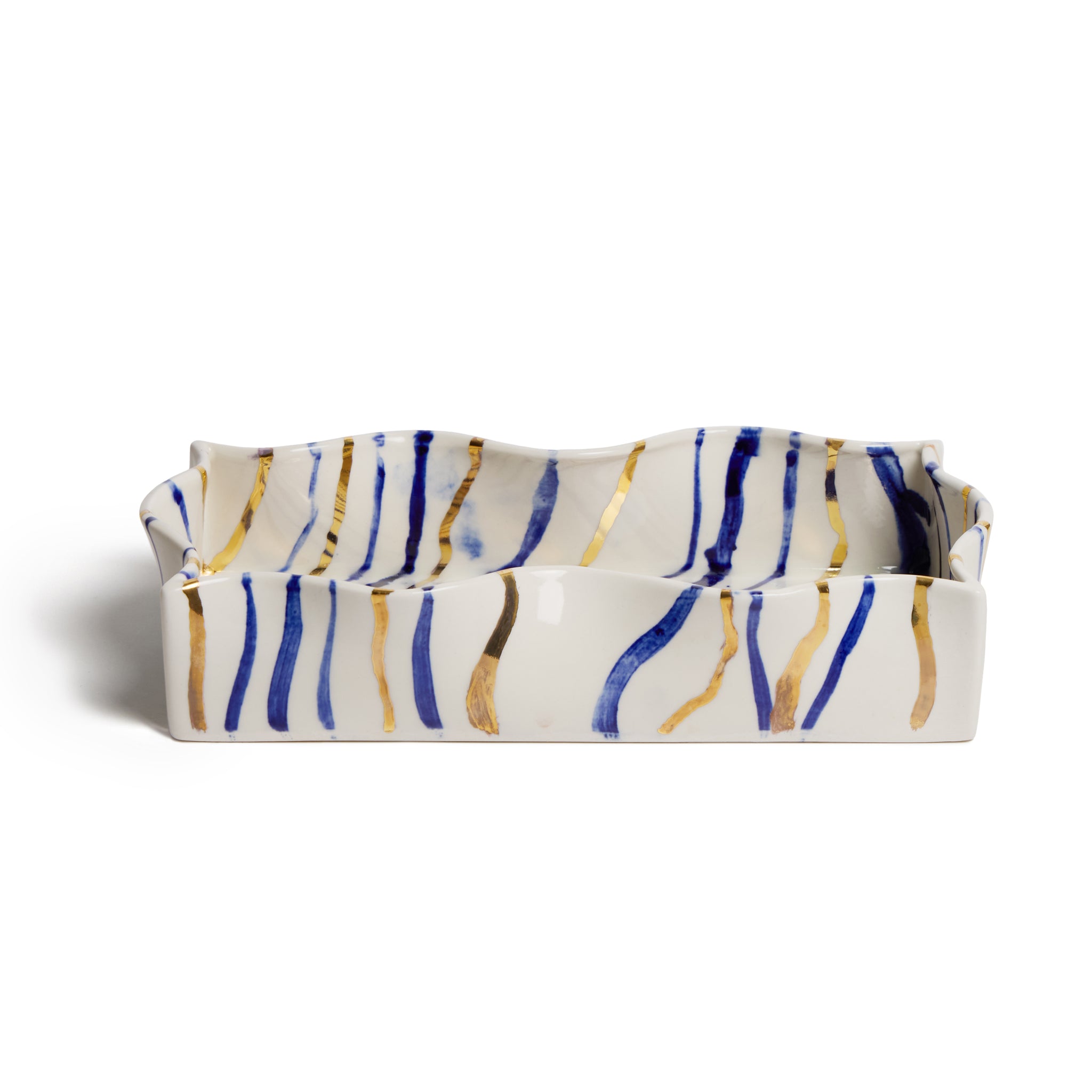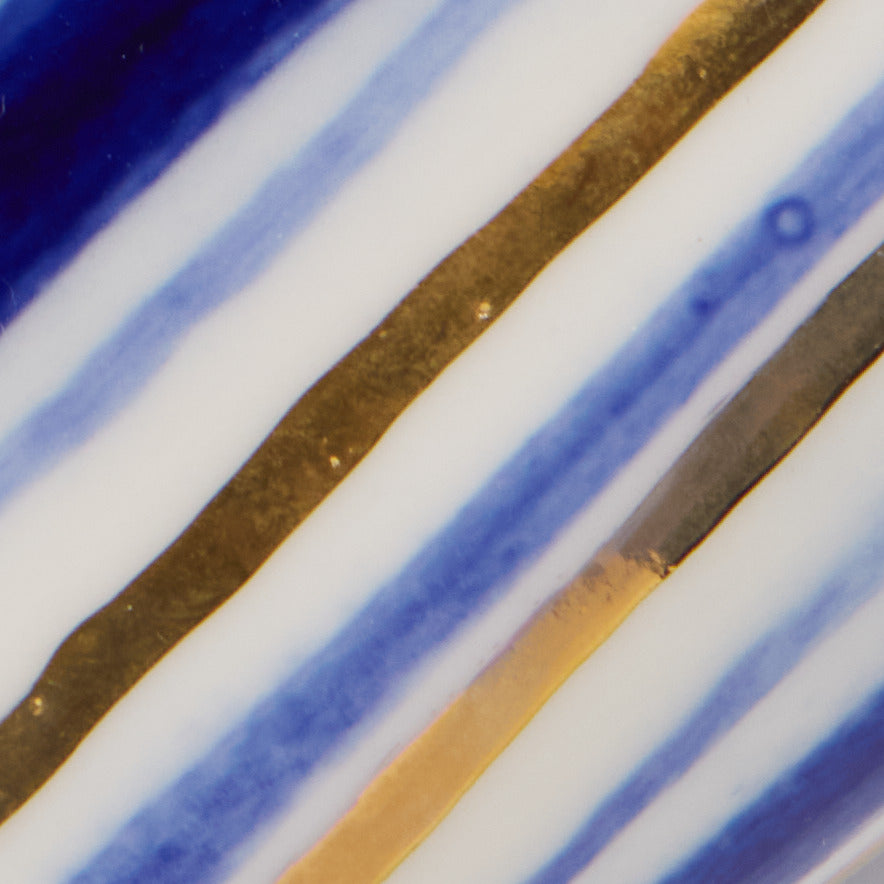 Description: Ceramic Striped Tray/Porcelain Tray/ Blue and White stripe ceramic/Glazed Blue and Gold Stripe/ Hand Decorated/ Hand Wash only/ Designed and Handmade in the UK