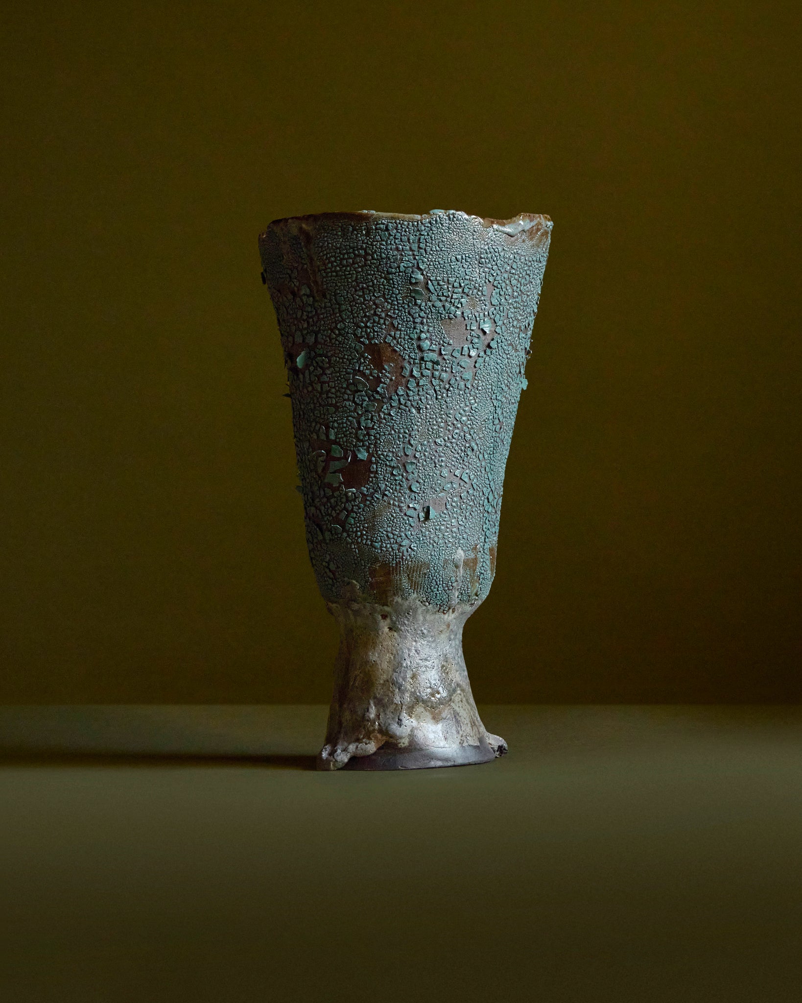 Part of Deborahs goblet vase series, this piece can be used as a stand-alone sculpture as well as a beautiful vase for flowers. Made from multi glazed stoneware with a reptilian blue finish.