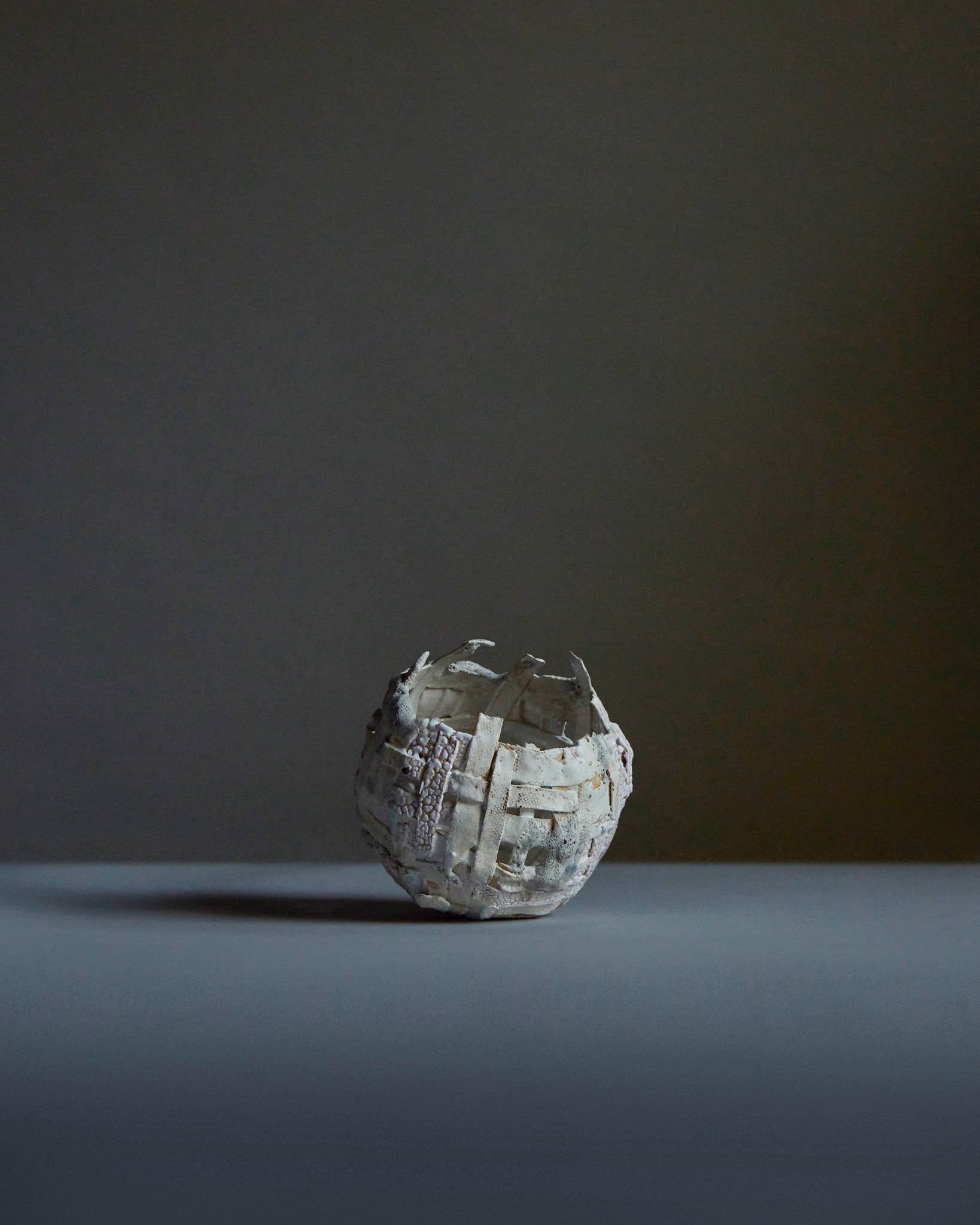 White stoneware ornamental globe sculptural vessel decorated with a multi layered matt and white pearlescent glaze.