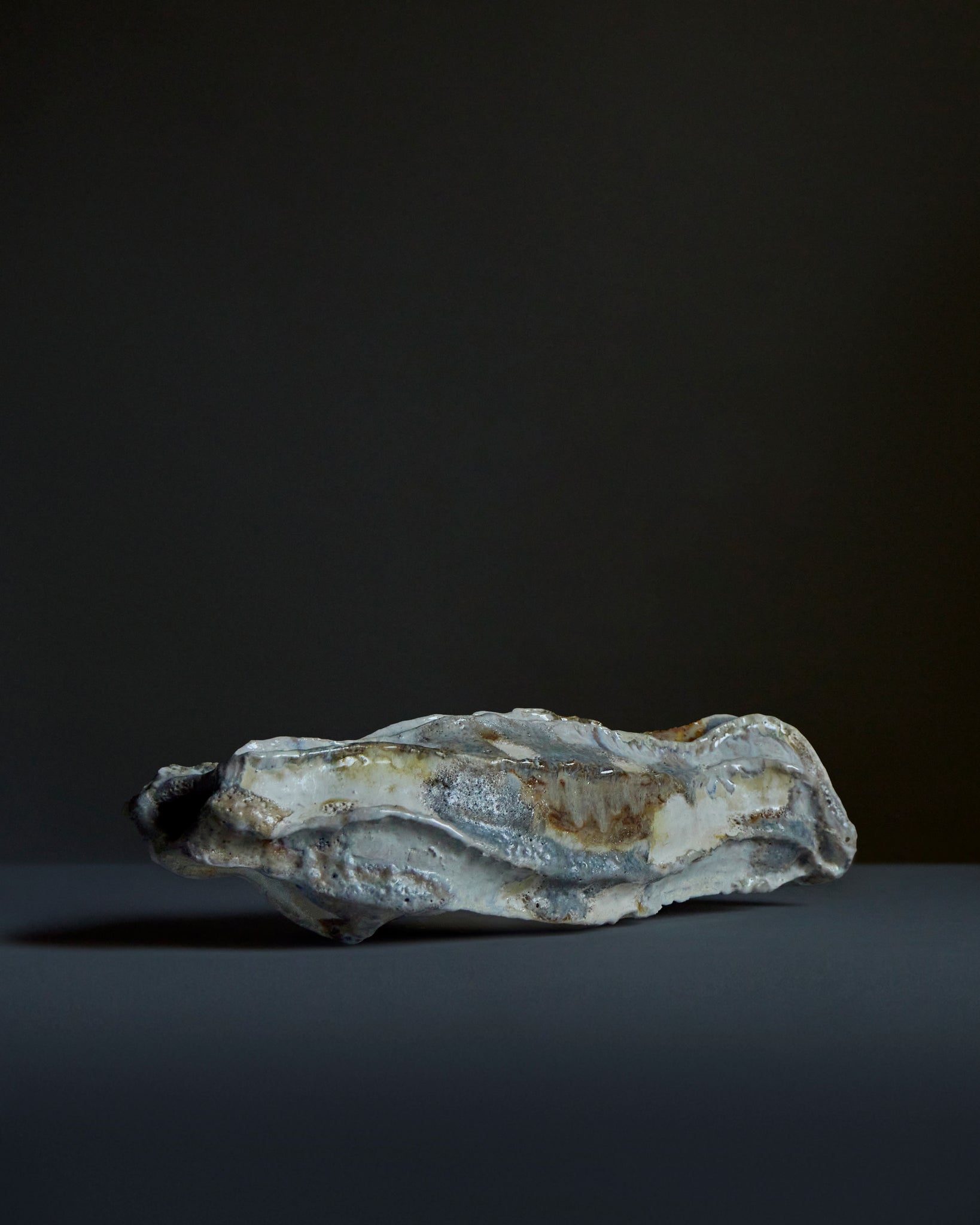 Ornamental sculpture of a seed pod demonstrating Deborah’s love of tactile, fluid shapes made from white stoneware clay and finished with a multi layered glaze.